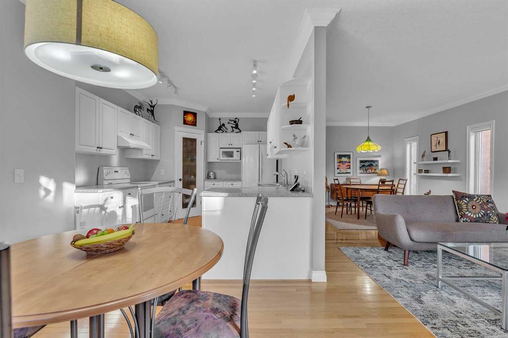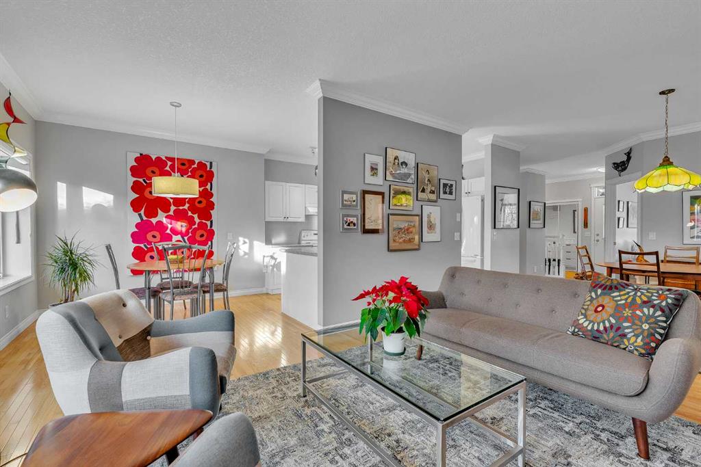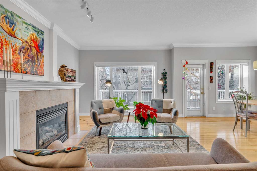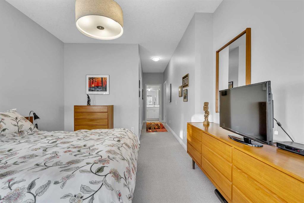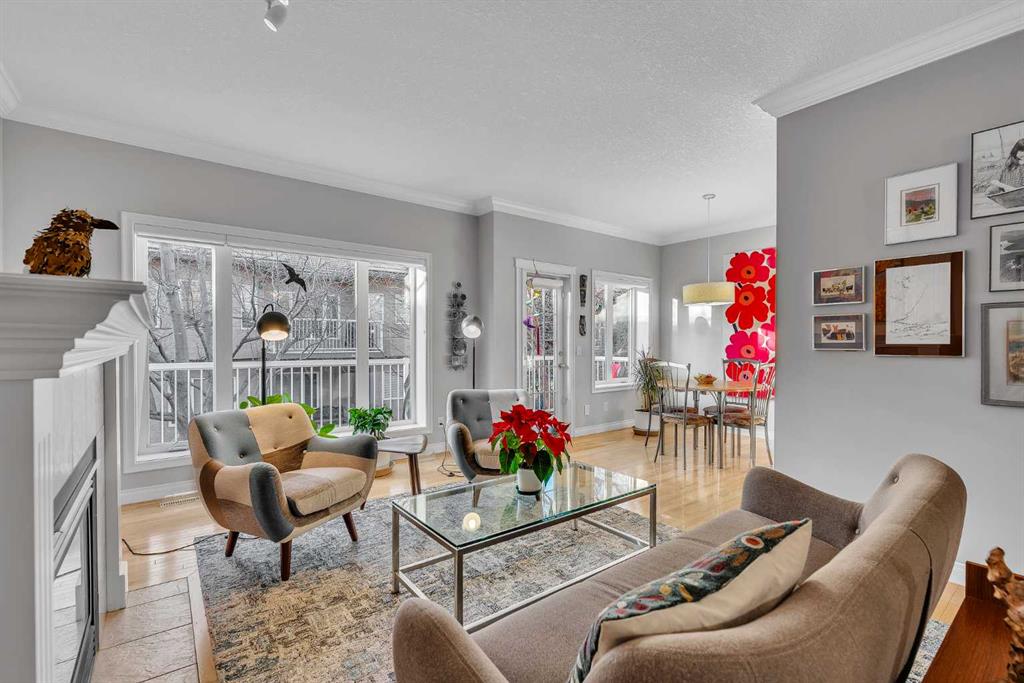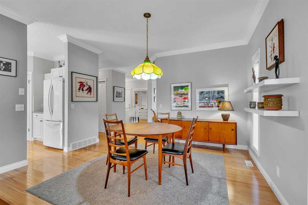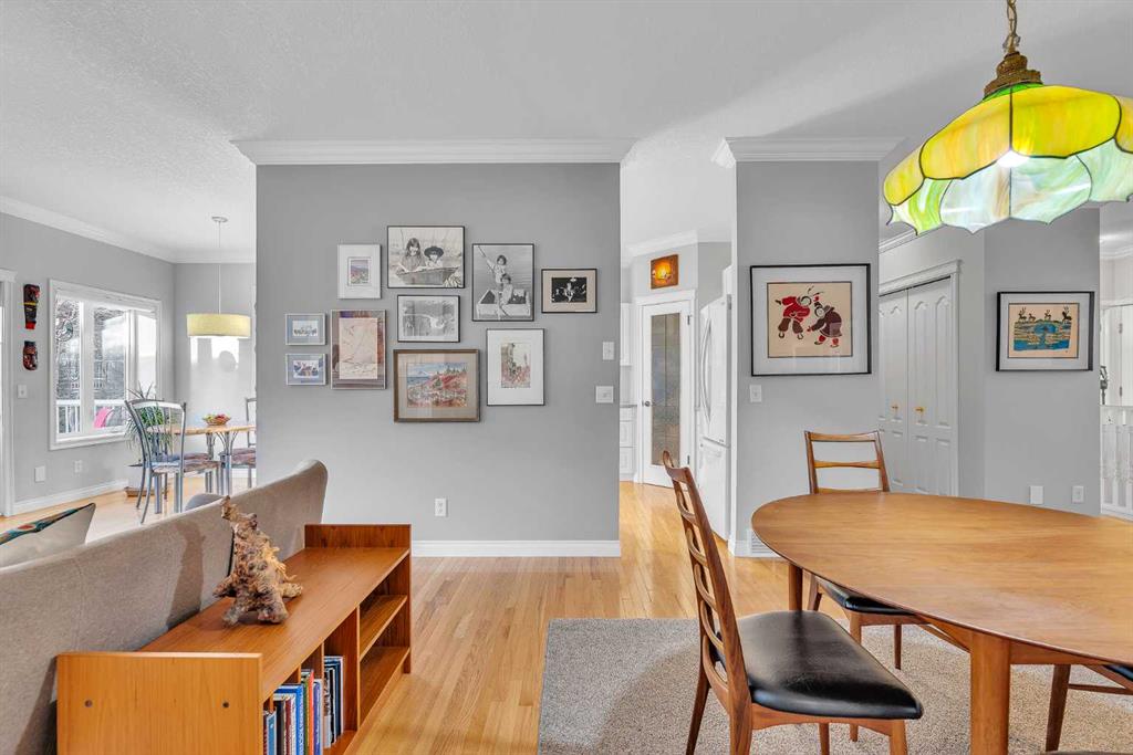 Natural light and timeless design, as well as one of the biggest floorplans in this complex, give this beautiful Shawnessy villa style and comfort in this sought-after adult (35+) estate area. Attractive landscaping frames the front porch, and inside, transom windows flood a spacious entryway with sunshine from the east. A front room makes a great home office, and features statement floor-to-ceiling windows that bring in the morning light for a perfectly illuminated workspace. The main living space begins with a sunny and open dining area. Clean lines and gorgeous hardwood balance warmth and elegance as you continue into the open living room. A gas fireplace is the focal point, inviting guests to cozy up for great conversation. In the kitchen, a monochrome palette creates an understated yet sleek aesthetic complete with white appliances. A full pantry is a desirable element, and counterspace is plentiful; sure to impress the chef of the household. A breakfast nook steps out to the balcony, with dappled shade from the treed courtyard – an ideal setting for winding down as you take in the sunset skies to the west. This level holds the primary bedroom, which is a peaceful private retreat. This secluded space includes a huge walk-in closet and an ensuite with a soaker tub and separate stand-up shower. A functional layout has the powder room and laundry just next to the entry from the double attached garage to finish this level. Downstairs, the finished basement provides tons of additional living space, with a large family room, another bedroom with a walk-in closet, and another full bathroom. The utility room also offers a massive storage area for all your seasonal items. This home has a central vac and air conditioning, as well as a new hot water tank. The complex itself is well laid out, with privacy and quiet as priorities. This home is very near the recycling and waste sheds and visitor parking, perks you and your guests will appreciate. This neighbourhood is popular for its green space, with pathways beginning only steps from your door and winding all the way to Fish Creek Park. Convenience is also a benefit; the Shawnessy shopping area is just minutes down the road, offering a plethora of stores, services, and amenities. The C-train is also nearby, giving commuters the option to hop on the LRT, or drive downtown via convenient access to Macleod Trail. Proximity to major routes like Stoney Trail put any area of the city in easy driving distance, and this community is also near Highway 22X, where you will find iconic Spruce Meadows, as well as an easy escape west into the mountains for your favourite outdoor activities like camping, hiking, mountain biking, and skiing. With 2195 sqft of developed space, this floorplan is a rare find, call today.